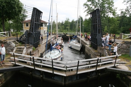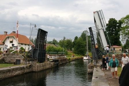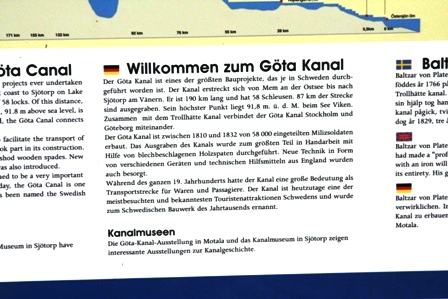 Bald erreichten wir Forsvik wo sich die höchste und älteste Schleuse des Götakanals befindet. Ein absolutes Muss für Schwedentouristen. So natürlich auch für uns. Auf Informationstafeln in verschiedenen Sprachen wird über die Geschichte der Planung und Entstehung des Kanals aufgeklärt. 58000 Schwedische Soldaten gruben in 22 Jahren, größtenteils in Handarbeit, diese 87,3 Kilometer lange Rinne. Nur Schiffe bis 30 Meter Länge, 7 Meter Breite und einem Tiefgang von 2,82 Meter dürfen diesen Kanal befahren. Jedesmal, wenn die Schleuse zur Passage geöffnet wird, muss die Fahrbahn über den Kanal hochgeklappt werden.