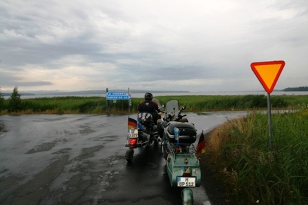 Am Mjosa-See, dem mit einer Fläche von 365 Quadratkilometer und einer Tiefe bis zu 449 Meter größten See Norwegens, entlang ging es flott auf der E6 weiter bis Hamar. Von hier aus fuhren wir Richtung Schweden. Über Elverum, wo wir wieder auf die Glama steißen, und Kongsvinger erreichten wir gegen 15:00 Uhr bei Magnor die Grenze und verabschiedeten uns vom Norwegischen Teil unserer Tour. Als Erstes war natürlich umflaggen angesagt.