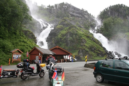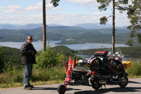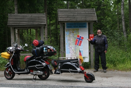 Bei Nössemark, bei Km 26541 um 13:00 Uhr überschritten wir dann die Grenze zu Norwegen. Vor lauter Genießen und Schauen hätten wir sie beinahe übersehen. Schnell waren auch wieder die Flaggen getauscht.Leider zog sich die Sonne hinter die aufkommenden Wolken zurück. Durch Halden, eine Stadt die auf eine 8000 jährige ununterbrochene Besiedelung zurückblicken kann, führte uns der Weg weiter bis Askim. Leider vermieste uns der aufkommende Regen die Suche nach einem Zeltplatz. Bei strömendem Regen steuerten wir lieber gegen 17:00 Uhr einen Hüttenpark in Vestby an. Nach einer anständigen Brotzeit ging es dann auch bald in die Schlafkoje.