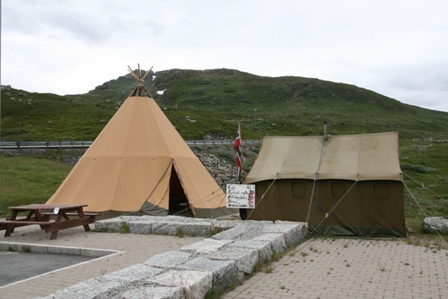 Was macht ein indianisches Tipi auf 1000 Meter Meereshöhe in Norwegen? Es ist eine Brotzeitstation. Ein Norweger lebt hier ein halbes Jahr im "Sommer" ( bei 10 Grad ), macht für Vorbeikommende belegte Brote mit Beeren, Rentierschinken, Käse und natürlich heißen Kaaaffffeeee!!!!! Als Besonderheit gibt es auch noch Hamburger. Das große gelbe M habe ich aber Gott sei Dank nicht gesehen. Außerdem versorgt er ein Rudel wild lebender Schweine, die nur zu ihm Vertrauen haben.
