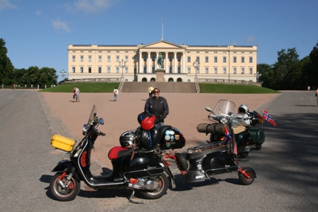 Bedeckter Himmel erwartete uns am Morgen des 09.07.2010. Warm angezogen machten wir uns um 07:00 Uhr auf den Weg nach Oslo., das wir um 08:15 Uhr erreichten. Auf dem Weg in die Innenstadt überholten wir eine Vespa ET2, übrigens die einzige Vespa die wir in Skandinavien sahen. Auch hier herrsch Plaste und Elaste vor. Als erstes steuerten wir natürlich den Rathausplatz an. Sind Betonsockel eine Absperrung für Vespas? Ein Foto vor dem Rathaus musste auf alle Fälle sein. Der Blick von hier auf den Oslofjord ist schon beeindruckend.